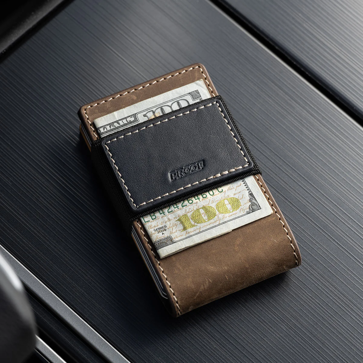 The PROOF Wallet incorporates fine top grain and full grain leather and aerospace metals into a sleek, ultra functional minimalist design. It allows carrying up to 25 cards safely and securely with built in RFID Blocking internal materials. We've topped it off with a snug cash strap on the back and an intuitive pull strap on the front for easy card access.